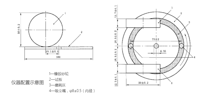 5. 1. 3 记数器,记录转台的循环(运转)次数 。 5. 1. 4 吸尘装置,有两个吸尘嘴。 一个吸尘嘴位于商个砂轮之问,另一个则位于沿直径方向与一个吸生嘴呈相反的位置。 两个吸尘嘴軸线之同的距离为(75士2)mm,吸尘嘴与试板之同的距离为(1~2)mm。 吸尘嘴定位后,吸尘装置中的气压应比大气压低1. 5 kPa2 ~1. 6 kPa。 5. 2 砝码,能使每个橡胶砂轮上的负载逐渐増加,大为1 kg。 5. 3 整新介质,以磨擦圆片的形式存在,用于整新橡胶砂轮。 注:应根据不同的橡胶砂轮进择不同的整新介质。 5. 4 技推板,厚度为(0. 8~1)mm,用于仪器的校准(參见附 B). 5.5 天平,精到0.1 mg。 6 取样按GB/T 3186的规定,取受试产品(或多涂层体系中每一个产品)的代表性样品。 按GB/T20777的规定,检査和制备试验样品。 7 试板7,1底材 除非另外商定,按GB/T9271的规定选择底材,如有可能,应尽量选择与实际使用时相同类型的材料。试板底材应平整且没有变形,否则受试涂层的磨耗将不均匀。 7,2形状和尺寸 试板的形状和尺寸应能使试板正确固定在仪器上,试板中心开有一个直径为6.35mm的孔a 注:常用的试板尺寸为100mmX100mm或f100mm。 7.3处理和涂装 除非另外商定,接GB/T9271的规定处理每一块试板,然后将受试产品或产品体系按规定的方法进行涂装。 7.4干操和状态调节 将每一块已涂i案的试板在规定的条件下干燥(或烘烤)并放置(如适用)规定的时同。 7,5涂层的厚度 按GB/T13452.2规定的一种方法测定于膜的厚度,以µm表示。 8 步骤8,1试验条件 除非另外商定,在温度(23±2)℃和相对湿度(50±5)%条件下进行试验。 8.2仪器的技准 校准仪器(附B中给出了校准步骤的示例)。 8.3橡胶砂轮的准备 8.3.1检査様胶砂轮是否満足5,1‘2规定的要求。 8.3.2为确保機胶砂轮的磨耗作用维持在一恒定的水平,按照生产商的规定并按8.3,2.1至8.3.2.4准备橡胶砂轮。 8.3.2.1将所选择的橡胶砂轮安装到各自的凸環架上,注意不要用手直接接触磨標面。调节橡胶砂轮上的负載至有关方商定的值。 注:組胶砂、轮上的负载用砝码的标示质量(加压臂质量与砝码自身质量之和)来表示。 8.3,2.2将整新介质圆片安装到转台上。小心放下磨擦头使様胶砂轮放在圆片上。放置好吸尘嘴,调节吸尘嘴的位置使之距高国片表面约1mm。 8.3.2.3将计数器设定为零a 8.3.2.4打开吸尘装置然后启动转台。将橡胶砂轮在整新介质圆片上通转规定的转数来整新橡胶砂轮。 注:常用的转数是50转。 在测试毎个试样前以及每运转500转后都要以这种方式整新橡胶砂轮,使磨掠面刚好呈圆柱形,并且磨擦面与側面之同的边是観利的,没有任何弯曲半径。*使用前要整新新的様胶砂轮。 8.4测定 8.4.1除非另外商定,将涂膜试板在温度(23±2)°C和相对湿度(50±5)%条件下状态调节至少16h。8.4.2如果涂层表面因描皮、刷痕等原因而不规则时,在测试前要先预磨50转,再用不起毛的_纸擦净。如果进行了这一操作,则应在试验报告中注明a 8.4.3称重状态调节后的试板或已预磨并用不起毛的纸擦净的试板,精到0.1mg,记录这一质量。8.4.4将试板固定在转台上,把磨據头放在试板上,放好吸尘嘴。 8. 4. 5 将计数器设定为零,打开吸尘装置,然后启动转台 。 8. 4, 6 经过期定的转数后,用不起毛的紙将残留在试板上的任何琉松的磨屑除去,再次称量试板并记这一质量 。 检査试板看涂层是否被磨穿 。 8. 4. 7 通过以一定的问隔中断试验来更精地测量磨穿点并计算经过规定转数的磨擦循环后的平均质量损耗a 8. 4. 8 在另外两块试板上重复8‘4. 2至8. 4, 6的步骤并记录结果。 9 结果表示9. 1 对每一块试板,用减量法计算经商定的转数后的质量损耗 。 计算所有三块试板的平均质量损耗并报告结果,精到1 mg。 注:也可计算中断试验的每个同隔的质量损耗。 9. 2 计算法层或多涂层体系中的面涂层被磨穿所需的平均转数 。 注: 抹层磨穿后,质量损耗受底材磨损的影响. 10 精密度参见附录 C。 11 试验报告试验报告至少应包括下列内容: a) 识别受试产品所必要的全部细节, b) 注明参照本标准 c) 补充资料的条款见附录A, d) 注明为补充上述 c)项资料所參照的标准或国家标准、产品规格或其他文件; e) 橡胶砂轮的负载及所用.橡胶砂轮的类型, f) 第9章所指出的试验结果, g) 表面是否因为不规则而进行预磨, h) 与规定的试验方法的任何不同之处; i) 试验目期。 附 录 A (规范性附) 需要的补充资料 为使本方法能正常进行,应适当提供本附中所列的补充资科的条款。 所需要的资料应由有关方商定,可以全部或部分地取自与受试产品有关的标准、国家标准或其他文件。 a) 底材的材料、厚度和表面处理; b) 受试涂科施法于底材的方法,如果是多涂层体系还应包括涂层同干燥的时同和条件; c) 试验前,涂层干燥(或供烤)并放置(如适用)的时同和条件 l d) 干涂层的厚度(以µm计),按 GB/T13452. 2进行测量的测量方法以及是单一涂层;还是多涂层体系 , e) 与8. 1规定不同的试验温度和湿度。 附 录 B (资科性附录仪器的校准) B.1 总则 校准所需的辅助设施如技准板和砂纸从磨耗仪生产厂获得。通常生产厂把锌板作为校准板. B.2 仪器 仪器除符合第5章规定外,还应包括下列设施 。 B.2.1 两个橡破轮 每个棟胶轮厚(12. 7士0. 1)mm,总直径为(50. 0±0. 2)mm(包括外面包覆的棟胶条) ,轮子外周包覆一条厚6 mm、硬度为(50士5)IRHD(按 GB/T6031-1998规定进行测定)的橡胶条。将線胶轮安装在水平转轴上并能