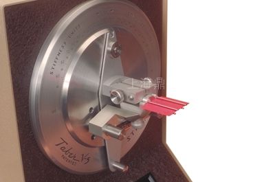 1、 根据电压等实际情况,选择合适的保险管装上,然后将保险槽插入开关选择器中。具体指引请见图2 1、 连接电源(115或则220V,50/60Hz)。用户只需选择两条电源线中合适的一条即可。 2、 打开开关。开关在仪器背面电源线上端位置。屏幕上将显示”Taber Stiffness Tester Model 150-E”。这说明仪器已经准备好可以工作了。 样品准备使用选购的的Triple Cut Specimen Shear样品裁切器(图3),可以将0.020英寸厚度以下的纸、塑料、金属片和箔裁切成均一尺寸(1 1/2 X 2 3/4英寸或者1 1/2 X 1 1/2英寸)。将材料直接放到裁切器的刻度端然后快速压下手柄即可。 将材料裁切成合适尺寸后,立刻标记样品以便记录区分。如果由于材料的纹理导致它一边的挺度值偏大,请做双向测试。推荐每一个纹理方向的样品都准备5-10个。取这些样品的平均值作为终测试结果。 如果材料对湿度很敏感,那么样品在测试前,至少要有24小时处于在恒温恒湿的环境中,时间是72小时。 样品在测试前,请务必注意它是笔直的。但是,不要尝试将弯曲的样品弄直。如果样品严重弯曲,请选择另一块样品。 范围1的操作步骤高敏感附件 编号:150-14 对于非常轻的材料的挺度测试,比如玻璃纸、天然纤维、人造丝、薄纸、金属箔片等,需要选择高敏感范围。图4是附件示意图,需要使用的时候装配到仪器上。 图4 范围1用于1.0单位以下的材料测试。安装附件时请遵循以下步骤: 1、向前拉卸下滚轮组件。 2、旋开夹具边上的螺丝,使夹子*打开。 3、拿着高敏感附件驱动针的夹具部分安装到夹子之间,使得驱动针正好与夹子底部表面接触。 请注意:驱动针夹具上部标注有“TOP”那一面朝上。 3、 旋紧夹具螺丝。为了是钟摆平衡,驱动针应处于夹子中央位置。 4、 驱动针的夹具部分放在转盘的两个柱头螺栓之间。 5、 裁切样品,尺寸是1 1/2 x 1 1/2英寸。 6、 松开凸边翼形螺钉并向右滑动。这样就能在针之间安装样品。在针之间插入样品,样品后沿平行并距离夹具部分大约1/16英寸处。左边第二、第四根针应处于测试样品的上方,如图4所示。 7、 将翼形螺钉向左滑动直至顶部的针与样品接触。(注意:使顶部的针与样品接触而不是用力压紧样品,否则会引起钟摆偏斜。) 8、 旋紧螺丝以固定驱动针的位置。 10、这样,仪器已经正确安装。按开始进行测试。 重要事项:在进行测试前,请在钟摆上端的柱栓安装10单位的补偿砝码,如图4所示。 提示:当使用150-E进行高灵敏度附件进行测试时,范围设定1且仪器进入自动或手动操作模式。在此设定范围钟摆只向右工作,且无需使用滚轮。 范围2的操作步骤1、开机,设定范围2。 2、如图5所示,滚轮位置要互换并倒置――止动轮在左边而右边是标准轮,钟摆上端纺织补偿砝码。 3、选择自动模式。这时更改必要的设置如标记、次数。 4、安装样品片,其露出夹具上端部分不超过1/16英寸,后沿线与钟摆表面平行。样品必须处于夹具的中央基准线位置。必要时用户可以通过夹具螺丝调整。 5、旋紧夹具螺丝固定样品片。对于有弹性的样品,请小心不要旋得太紧以致压变形。 6、调节挺度仪水平角,使钟摆的黑线与转盘上的0线对齐。 7、用调整钮移动右边滚轮向右移动直至它刚好与样品接触却又不使其偏斜。保证滚轮没有把钟摆推离零位。如果它不在零位,请小心移动滚轮后退使钟摆重新归零。 8、稳定缓和的旋动止动钮,使左边滚轮移向样品,直至激活自动停止器。(自动停止器激活时会听到特别的滴答声。) 9、旋转调整钮1/4圈使左边滚轮轻微后退。调整旋钮上有4条黑色线,与相邻线互成90度角。选择合适的一条并注意它的位置。然后,逆时针旋转调整旋钮使相邻的黑线准确处于前一条黑线的位置。后退1/4圈的步骤完成。 注意:右边的滚轮无需调整后退。 10、仪器调整完毕,按可以开始测试。 重要提示:由于挺度仪的高灵敏性,它会使材料的变化扩大。因此,推荐做5张或者更多的样品测试并取平均值。 范围3及3以上的操作步骤钟摆在10-100挺度单位且没有加砝码的情况下被校准的。增加砝码可以改变范围。参见Set Up Chart表格的Range Weight范围砝码可知应加砝码。测量范围的砝码装在钟摆下端的柱栓上(图6)。另外,在选择测量范围的时候,屏幕上也会显示所需的砝码。 1、开机,设定测试范围 2、如图6放置滚轮。止动滚轮(Ratchet Stop Roller)安装在转盘的右端柱栓上,标准滚轮(Regular Roller)则安装在左边。 3、如果屏幕显示“Press 0 to Zero”,请按0键。 4、按照第12页的校准指引,校正仪器。 5、安装样品片,其露出夹具上端部分不超过1/16英寸,后沿线与钟摆表面平行,但是不能接触到。 6、样品必须处于夹具的中央基准线位置。必要时用户可以通过夹具螺丝调整。旋紧夹具螺丝固定样品片。对于有弹性的样品,请小心不要旋得太紧以致压变形。 7、调节挺度仪水平角,使钟摆的黑线与转盘上的0线对齐。 8、用调整钮移动右边滚轮向右移动直至它刚好与样品接触却又不使其偏斜。保证滚轮没有把钟摆推离零位。如果它不在零位,请小心移动滚轮后退使钟摆重新归零。 9、稳定缓和的旋动止动钮,使左边滚轮移向样品,直至激活自动停止器。(自动停止器激活时会听到特别的滴答声。) 10、旋转调整钮1/4圈使左边滚轮轻微后退。调整旋钮上有4条黑色线,与相邻线互成90度角。选择合适的一条并注意它的位置。然后,逆时针