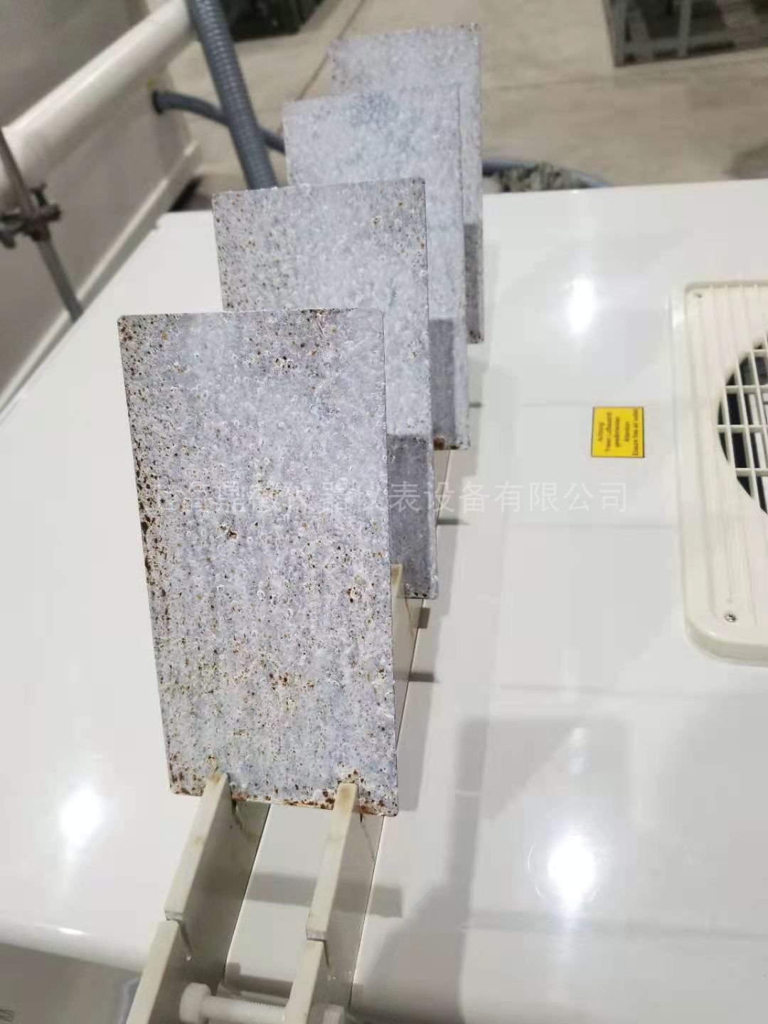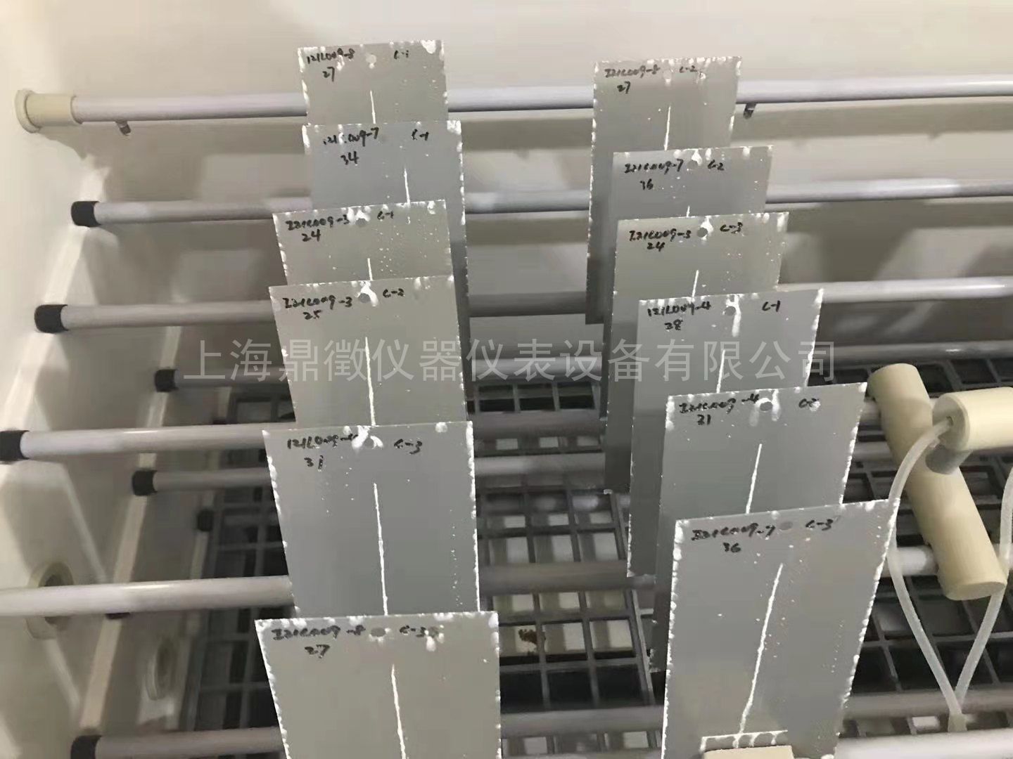 人工模拟盐雾试验又包括中性盐雾试验、醋酸盐雾试验、铜盐加速醋酸盐雾试验、交变盐雾试验。 1、中性盐雾试验(NSS试验)是出现早目前应用领域广的一种加速腐蚀试验方法。它采用5%的氯化钠盐水溶液,溶液PH值调在中性范围(6~7)作为喷雾用的溶液。试验温度均取35℃,要求盐雾的沉降率在1~2ml/80cm.h之间。 2、醋酸盐雾试验(ASS试验)是在中性盐雾试验的基础上发展起来的。它是在5%氯化钠溶液中加入一些冰醋酸,使溶液的PH值降为3左右,溶液变成酸性,后形成的盐雾也由中性盐雾变成酸性。它的腐蚀速度要比NSS试验快3倍左右。 3、铜盐加速醋酸盐雾试验(CASS试验)是国外新近发展起来的一种快速盐雾腐蚀试验,试验温度为50℃,盐溶液中加入少量铜盐—氯化铜,强烈诱发腐蚀。它的腐蚀速度大约是NSS试验的8倍。 4交变盐雾试验是一种综合盐雾试验,它实际上是盐雾腐蚀试验箱中性盐雾试验加恒定湿热试验。它主要用于空腔型的整机产品,通过潮态环境的渗透,使盐雾腐蚀不但在产品表面产生,也在产品内部产生。它是将产品在盐雾和湿热两种环境条件下交替转换,后考核整机产品的电性能和机械性能有无变化。 三、盐雾试验标准及试验结果的判定 上海鼎徵仪器仪表设备有限公司 标准是对重复性事物和概述所做的统一规定。盐雾试验标准是对盐雾试验条件,如温度、湿度、氯化钠溶液浓度和PH值等做的明确具体规定,另外还对盐雾试验箱性能提出技术要求。同种产品采用那种盐雾试验标准要根据盐雾试验的特性和金属的腐蚀速度及对盐雾的敏感程度选择。 下面介绍几个盐雾试验标准,如GB/T2423.17—1993《电工电子产品基本环境试验规程试验Ka:盐雾试验方法》,GB/T2423.18—2000《电工电子产品环境试验第2部分:试验:盐雾,交变(氯化钠溶液)》,GB5938—86《轻工产品金属镀层和化学处理层的耐腐蚀试验方法》,GB/T1771—91《色漆和清漆耐中性盐雾性能的测定》。 盐雾试验的目的是为了考核产品或金属材料的耐盐雾腐蚀质量,而盐雾试验结果判定正是对产品质量的宣判,它的判定结果是否正确合理,是正确衡量产品或金属抗盐雾腐蚀质量的关键。盐雾试验结果的判定方法有:评级判定法、称重判定法、腐蚀物出现判定法、腐蚀数盐雾腐蚀试验箱据统计分析法。评级判定法是把腐蚀面积与总面积之比的百分数按一定的方法划分成几个级别,以某一个级别作为合格判定依据,它适合平板样品进行评价; 称重判定法是通过对腐蚀试验前后样品的重量进行称重的方法,计算出受腐蚀损失的重量来对样品耐腐蚀质量进行评判,它特别适用于对某种金属耐腐蚀质量进行考核; 腐蚀物出现判定法是一种定性的判定法,它以盐雾腐蚀试验后,产品是否产生腐蚀现象来对样品进行判定,一般产品标准中大多采用此方法; 腐蚀数据统计分析方法提供了设计腐蚀试验、分析腐盐雾腐蚀试验箱蚀数据、确定腐蚀数据的置信度的方法,它主要用于分析、统计腐蚀情况,而不是具体用于某一具体产品的质量判定。 盐雾试验有中性盐雾试验N SS、醋酸盐雾AA SS和铜加速醋酸盐雾CA SS、也称氯化铜醋酸盐雾试验三种,其中应用广的是中性盐雾试验。盐雾试验基本内容是在35摄氏度下,5%的氯化钠水溶液,在试验箱内喷雾,模拟海水环境的加速腐蚀方法,其耐受时间的长短决定耐腐蚀性能的好坏。 盐雾箱容积不小于012 m 3、好不小于014 m3、箱内温度35℃±2℃、喷雾压力70~170kPa、盐雾收集器至少两个、收集面积各80 cm 2.被试面与垂直方向成15~30°让盐雾自由沉降在被测面上、不能直接喷射、试验支架用玻璃、塑料制造、试件不能相互接触、互相滴液;箱内温度35℃±2℃、每个收集器收集溶液1~2 mLh.  盐雾试验检查方法及判定基准 盐雾试验箱主要对各种材质之表面经电镀、阳极处理、喷涂、防锈油防腐蚀处理后,测试其製品之耐蚀性的。在购买产品时,要严格检查产品的质量,看它是不是符合标准。那么,盐雾试验箱检查方法及判定基准: 一、 判定方法:测定面腐蚀状况测定,可依照如下标准施行。或由买卖双方事先协定之方法判定之。 1 外观评级 上海鼎徵仪器仪表设备有限公司 像镀锌等对底材呈阳性的电镀层,其表面的外观变化包括变色、失光,覆盖层腐蚀和基体金属腐蚀等。把其产生的各种变化分成A~I等共9个级别,各级外观的变化如下表所示。对镀层的评级可参照表中所列现象进行评定。 等级与外观 外观评级 样品表面外观的变化 * 无变化 B级 轻微到中度的变色 C级 严重变色或极轻微的失光 D级 轻微的失光或出现极轻微的腐蚀产物 E级 严重失光,或试样表面局部有薄层的腐蚀产物或点蚀 F级 有腐蚀产物或点蚀,且其中之一种分布在整个试样表面上 G级 整个表满上布有厚的腐蚀产物或点蚀,并有深的点蚀 H级 整个表面布有非常厚的腐蚀产物和点蚀,并有深的点蚀 I级 出现基体金属腐蚀 2 腐蚀评级 金属镀层的腐蚀评级是根据腐蚀缺陷所占总面积的百分数,按下列公式计算而得到: R=3(2—lg A) 式中 R-腐蚀评级数(为一修约的整数) A- 腐蚀缺陷所占总面积的百分数。 根据上述公式,可得到腐蚀缺陷面积(%)与腐蚀评级值的关系如下: 腐蚀评级与缺陷面积 缺陷面积% 腐蚀评级 缺陷面积(%) 腐蚀评级 无缺陷 10 ≤0.1 9 >0.1~0.25 8 >0.25~0.5 7 >0.5~1.0 6 >1.0~2.5 5 >2.5~5 4 >5~10 3 >10~25 2 >25~50 1 >50 0 二、 对油漆涂层的盐雾腐蚀结果的