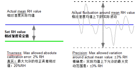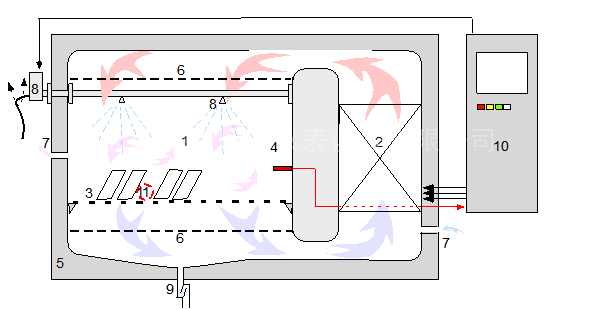 为了在整个试验过程中满足温度和湿度的精度要求,试验箱应配备能使经调节温湿度、空气流动性好的装置(试验区域内各部分的内部气流速度至少是若干厘米/秒-例如图1。)试验箱的四壁和盖板要求得到有效隔热,以避免这些表面出现过渡冷凝。空气流动性越好,隔热需求越少。 Wall heating should be avoided, due to that heating by radiation tends to keep test object close to the chamber walls locally too dry to be within humidity specification (or a screen shall be installed to avoid such an effect). Provided the internal air circulation is efficient, wall heating is not required. The chamber air must be continuously renewed by a purge of not less than 1 m3/ h per m2 of test area (exemplified by Fig. 1, Item 7). This to assure that the CO2-level is not significantly depleted under any exposure conditions. Fresh air can be added dry from a compressed source or taken from ambient conditions, unless significantly polluted (> 50 ppb SO2). 由于热量辐射会使靠近箱壁的试样过度干燥,达不到湿度要求,因此应尽量避免试验箱壁受热(或者添加遮挡板来避免受热)。如果内部空气流动良好,就不必进行箱壁加热。应配备1 m3/ h每m2的空气净化器使试验区域内的空气不断更新(例如图1第7项)。这是为了保持CO2水平,避免其在曝露条件下被耗尽。干燥的新鲜空气可以由压缩机提供,或使用室内的空气(除非空气被严重污染(> 50 ppb SO2))。