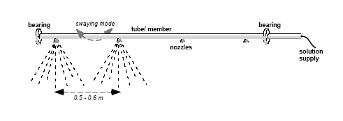 3.3 EXPOSURE TO SALT SOLUTION 曝露到盐溶液中 3.3.1 For a fully automated procedure , the chamber shall be equipped with a spray device capable of producing a finely distributed, uniform spray falling on the test objects. The most reliable way of receiving a fairly uniform downfall is by installing a moving spray device, like the swaying rail with overlapping nozzles, depicted in Fig. 3. The spraying device shall be made of corrosion resistance materials. Plastic is recommended. 3.3.1 对于全自动的试验,试验箱内应配备喷洒装置,能使溶液得到妥善分配,均匀喷洒到试样上。能有效使溶液均匀喷洒的方法是安装一套可移动的喷洒装置,如带交叉喷头的摇摆轨道,如图3所示。喷洒装置应由耐腐蚀材料制成,建议是塑料。  Fig. 3 Example of spray rig for obtaining uniform salt solution downfall. 图3 使盐溶液均匀喷洒的喷洒装置示例 A target average precipitation rate distributed over the workday 6 h wet period of this test procedure period is 5 L/m2, and shall not exceed 10 L/m2. For any local position the total precipitation over the 6 h period must not be lower than 3 L/m2 and not exceed 15 L/m2. Suggested nozzles type: Spraying Systems Uni Jet 800050VP. Mount the nozzles on a supporting tube 50-60 cm apart and about 1 m above the test objects. The nozzles shall be adjusted so that the fan plumes are in line with the tube/ supporting rail. An individual filter at each nozzle is strongly recommended to avoid any contaminations in the tiny slots. These low-cost plastic nozzles have a reliable function, but must be inspected in microscope at delivery in order to discard such with defect slot cuts. Stainless nozzles, even in 316 alloy, will be impaired by corrosion under the actual test conditions. Atomizing salt-spray nozzles should not be used, since they generate a too low precipitation rate to give sufficient leaching effect on the test objects. Achieving a uniform downfall with these types of nozzles can be difficult. 在本试验的工作日的6小时加湿阶段,平均喷洒密度的目标值为5 L/m2,且不能超过10 L/m2。在6小时周期内,箱内任何位置的喷洒密度都必须不低于3 L/m2,不高于15 L/m2。建议喷头类型:Uni Jet 800050VP喷洒装置。将喷头装在支承管上,相隔56-60cm,处于试样上方1米左右。调整喷头,使扇叶与支承管/支承轨成一直线。强烈建议在给每个喷头装上过滤器,以避免小槽中的污染物。虽然这些喷头价格低廉、功能可靠,但是发货时还须经过显微镜检验,以淘汰那些小槽切割不良的喷头。不锈钢喷头,就算是用316合金制成的,在也会在实际试验条件下受到腐蚀而损坏。雾化盐雾喷头喷洒密度过低,无法为试样起到有效的过滤作用,故不宜使用。这几类喷头喷洒都不均匀。 3.3.2 An automated spray-rig is allowed to be separated from the humidity chamber, i.e. the test objects are moved between two units on a work-day basis. 3.3.2 自动喷洒装置可从加湿箱中拆出来。也就是说,试样在一个工作日内在两套设备之间移动。 3.3.3 If there is no possibility to use an automated device for spraying, a manual spraying of the test object is allowed, either in or outside the test cabinet, provided: 1. The minimum precipitation rate of 5 L/m2 per 6 h wet session is fulfilled, 2. The spraying events are distributed over the 6 h period, so that the test object are kept constantly wet, and 3. The temperature requirement is fulfilled. 3.3.3 如果不能采用自动喷洒装置,可采用手动喷洒,在箱内箱外皆可,条件是:1. 在6小时加湿阶段完成前,喷洒密度至少为5 L/m2。2. 喷洒将分布在6小时周期内,以使试样保持湿润;并且;3. 保持要求的温度。 NOTE: Salt solution sprayed onto test objects must not be reused. 注意:喷洒到试样上的盐溶液不得重复使用。 4.0 Sample preparation 试样准备 Sample preparation before exposure, the sample orientation during exposure and the evaluation after exposure are usually stipulated in the engineering test standards addressing this test procedure. 曝露前试样准备,曝露期间的朝向和曝露后的评估方法一般会在本试验程序相关的工程试验标准中关于有所规定。 4.1 Painted and scribed panels: The test is optimized for exposing scribes in horizontal position on panels oriented to the angle stipulated in Paragraph 5.1.1. Scribe orientation has a similar effect on salt collection as the panel orientation. The scribe, or other type of damage, shall be positioned, so that a collecting area for precipitation is left above the exposed area of interest. 4.1 喷漆板和划线板:本试验已针对水平划线的板材按第5.1.1段所规定的角度朝向曝露进行了优化。划线的朝向的作用类似于板材朝向的盐聚集。划线或其他损伤都应定好位置,以便喷洒液收集区域位于目标曝露区域之上。 4.2 Component parts are to be in vehicle orientation position if at all possible. The salt solution spray should reach the areas of interest. 4.2 如果可能,零部件应尽量按照汽车朝向放置,并使盐溶液能淋到达目标区域。 4.3 Interested parties should agree on the location within the components where the corrosion is to be observed. 4.3 相关各方需商定零部件上将出现腐蚀的位置。 4.4 Interested parties should agree to any pre-conditioning, masking of edges, pre-testing, cleaning, or any other sample preparations. 4.4 相关各方需商定预处理、要遮盖的边缘、预测试、清洁或其他试样准备工作。 4.5 Interested parties should agree to any photographic details throughout the test and the areas to be examined and any assessments that are required. 4.5 相关各方需商定试验过程的具体细节、检测的区域以及要求的评估。 5.0 OPERATION 操作 5.1 BEFORE TEST START 试验开始之前 Prepare t