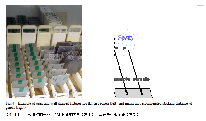 Fig. 4 Example of open and well drained fixtures for flat test panels (left) and minimum recommended stacking distance of panels (right) 图4 适用于平板试样的开放且排水畅通的夹具(左图);建议至小板间距(右图) 5.1.4 Duration of test: The number of test cycles shall be determined by the specification covering the component or object being tested. When not specified, the test period shall be agreed by the requester and the corrosion department. 5.1.4 试验持续时间:试验循环次数应由试样零部件或试样相关要求决定。如果没有要求,应由申请试验的一方和负责研究腐蚀的部门商定试验周期。 5.1.5 Control before test start: Run and monitor the test cycle at least a 24 h period before starting the test, provided not already in continuous operation. 5.1.5 试验开始前的控制:假如持续运行尚未开始,在试验开始之前先运行并监控试验循环至少24小时。 5.1.6 Start and end time of test: The test is only allowed to be started just before the first precipitation (Table I Step1A) in the weekly scheme, i.e. at the end of the "weekend" constant temperature/humidity phase. The test is ended at the end of the weekend humidity exposure. 5.1.6 试验的启动时间和结束时间:本试验只允许在一周计划中的一次喷洒(见表1,步骤1A)之前启动,即“周末"恒温恒湿阶段结束时。试验在周末加湿曝露阶段结束。 5.2 TEST EXPOSURE CONDITIONS 试验曝露条件 There are three basic exposure modes in the daily test scheme: 每日试验计划分三种基本曝露模式: 1. A continuous wet phase at 25± 2°C where the test objects are exposed to a 0.5% NaCl solution. The wet condition is maintained by intermittent spray exposure and with a temperature control without drying, or with the humidity control set high enough to not cause any practical drying. 1. 25± 2°C持续湿润阶段,在此阶段试样曝露到0.5%的氯化钠溶液中。通过间歇喷洒曝露和温度控制(不干燥),或调节湿度控制(足以防止物体干燥),试样的湿润状态得以保持。 2. A two-step transition from wet to controlled humidity climate. 2. 从湿润到受控湿度环境的两步过渡。 3. A period under constant temperature/ humidity control; 50 ± 0.6°C and 70 ± 3% RH. This is also the condition during weekend. 3. 恒温恒湿控制周期:50 ± 0.6°C,70 ± 3% RH。这也是周末的环境状态。