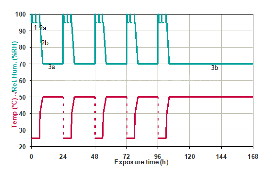 | 1a | 0 | 0 | 0 | 10* | 50* | 70* | Spray thoroughly 0.5% NaCl to wet and cool 0.5%氯化钠,湿透且冷却 | 1b | 0 | 10 | 0 | 20 | 30-50 | Wet | Cool chamber with maximum capacity 最大限度冷却试验箱 | 1a' | 0 | 30 | 0 | 3 | <30 | Wet | Spray to regain wetness (cooling dries) 通过喷洒使干冷的试验箱再次湿润 | 1c | 0 | 33 | 2 | 27 | <30 | wet (95) | 25±2 to be reached within 1 h from start (1a) 从步骤1a开始,一小时内达到25±2 | 1a' | 3 | 0 | 0 | 3 | 25±2 | wet | Secure and support wetness by spraying 通过喷洒保持湿润 | 1c' | 3 | 3 | 2 | 54 | 25±2 | wet (95) | wet (95) = OK to set to 95% RH 湿度(95)= 可以设置到95%RH | 1a' | 5 | 57 | 0 | 3 | 25±2 | wet | Defines wet condition before climate control 环境控制前明确湿工况 | 2a | 6 | 0 | 0 | 30 | 25±2 | wet (95) | Start of quick temperature rise without drying 开始快速加温,但不能干燥 | 2b | 6 | 30 | 2 | 00 | 40±0.61 | wet (95) | Start of slow drying by diffusion 通过扩散,开始缓慢干燥 | 3a | 8 | 30 | 15 | 30 | 50±0.61 | 70±3 | Panels shall be free from visible wetness 板上无可见水迹 | 3a | 24 | 00 | - | - | 50±0.61 | 70±3 | End of "workday" procedure “工作日"程序结束 | Repeat steps 1a - 3a another four times 步骤1a-3a再重复4次 | 3b | 120 | 00 | 48888 | 00 | 50±0.61 | 70±3 | Phase in with weekends in case of manual operations in "workday" procedure 假如“工作日"程序是手动操作,则在各个周末逐步进行 | 3b | 168 | 00 | - | - | 50±0.61 | 70±3 | Repeat steps 1a-3b for required number of weeks 步骤1a-3b重复次数按各周要求 |