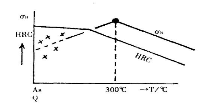 ----由此图可见硬度随回火温度的升高而下降,但在淬火状态以及300℃以下低温回火时,硬度与抗拉强度的关系难以成立。当回火温度在300℃左右时,kg/m㎡与HRC具有相关关系,即硬度高,抗拉强度就高;硬度低,抗拉强度就低。在低温回火状态欲求出kg/m㎡值是很困难的,因为此时抗拉强度值分布很离散。 ----由于低温回火件的kg/m㎡不稳定而不能确定,故在日本工业标准(JIS)中也是通试验来测定400℃以上温度回火件的拉伸特性(也有300℃回火工件)。换言之是只对调质件(淬火+400℃回火)进行拉伸试验。在工业上只是在要求抗旋转弯曲疲劳和抗磨损时才使用低温回火件。高频淬火和渗碳淬火即为此适用例。受拉应力的零件不采用低温回火。不过在低碳钢中,但淬火M能发生自回火(故Ms点高)时,亦有在淬火状态下使用者。低碳钢的板条马氏体组织结构自回火,正可在工业上应用,但此时必须考虑淬透性和质量效应(必要时应添加B、Cr、Mn等金属元素)。 硬度与抗拉强度对照表(仅供参考):