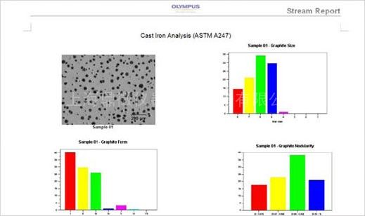 软件还可自动生成报告 通过数字化的方式对铸铁进行分析除了用到软件以外,产品金相显微镜GX53。GX53是一款倒置金相显微镜,由于可以将磨平抛光的样品直接平放在倒置显微镜的机械载物台上,因而可以确保在移动载物台观察时,始终保持样品聚焦。替换上10X金相物镜,可以对铸铁样品进行10倍放大。
